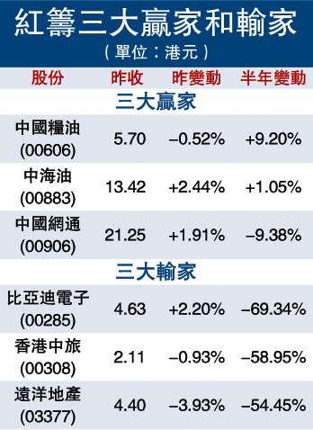 中新網(wǎng)7月1日電 據(jù)香港大公報(bào)報(bào)道,自從工商銀行等多只重磅國(guó)企H股先后來港上市后,紅籌股顯然已經(jīng)“靠邊站”,不再是市場(chǎng)焦點(diǎn)。紅籌指數(shù)上半年屢跌1361點(diǎn),或22.2%,在昨日收?qǐng)?bào)4750點(diǎn);中國(guó)糧油是H股上半年表現(xiàn)最佳的紅籌股,升幅9%。
