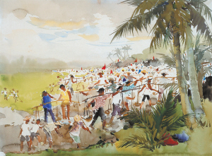 我鉆進(jìn)椰子林作畫(huà),其熱無(wú)比,連油色的錫管都燙手。忘了在何處,林中小蟲(chóng)特多,咬得緊,穿著長(zhǎng)褲、長(zhǎng)袖襯衣,且將袖口和衣領(lǐng)都包得嚴(yán)嚴(yán)實(shí)實(shí),但回到宿店才知滿身都是紅塊塊,奇癢難忍,店主頗可憐我,說(shuō):氓!氓!我聽(tīng)不懂廣東話,她用筆寫(xiě),原來(lái)是蚊。
