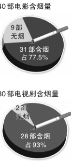 從2007年開始,中國控?zé)焻f(xié)會每年都會對熱播的國產(chǎn)影視劇中的吸煙鏡頭進(jìn)行監(jiān)測統(tǒng)計。對2009年熱播的40部電影和30部電視劇進(jìn)行的監(jiān)測結(jié)果顯示:在40部電影中有9部電影完全沒有煙草鏡頭,31部影片有煙草鏡頭,占影片的77.5%;30部電視劇中,2部沒有煙草鏡頭,28部有煙草鏡頭,占電視劇比例的93%。