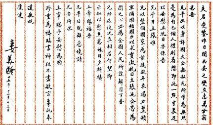 兄不自檢束,竟遭不測之禍,致令至愛憂傷,罪何可言。今事既至此,惟有不愧為吾妻之丈夫,亦不愧負吾總理與吾父吾母一生之教養(yǎng),必以清白之身還我先生,只求不愧不怍無負上帝神明而已。家事并無掛念,惟經國與緯國兩兒皆為兄之子,亦即吾妻之子,萬望至愛視如己出,以慰吾靈。經兒遠離十年,其近日性情如何,兄固不得而知;惟緯兒至孝知義,其必能克盡孝道。彼于我遭難前一日尚來函,極欲為吾至愛盡其孝道也。彼現(xiàn)駐柏林,通信可由大使館轉。甚望吾至愛能去電以慰之為感。