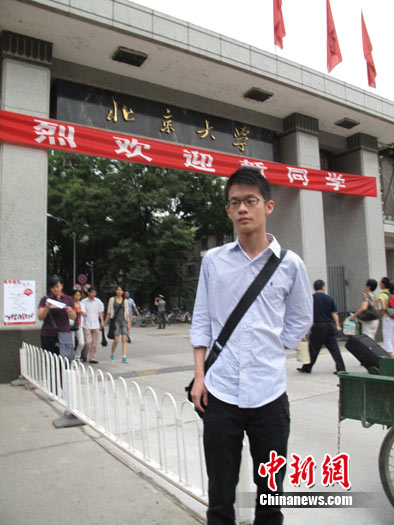 今天上午10時(shí)左右,身著藍(lán)條襯衫、深藍(lán)褲子,個(gè)子高挑的李戡終于出現(xiàn)了。有北大女生發(fā)出了驚呼:“看,他臉上還有小痘痘呢!”李戡的媽媽今天陪他過來,她表示沒想到兒子今天上午被媒體全程跟隨——從報(bào)到、辦理飯卡到宿舍,再到校外,李戡就一直在不停地回答問題。