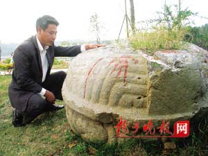 記者看到,這尊“赑屃”石刻沒有頭,根據(jù)風化程度推測,頭部大約是在100年前脫落的,身上馱的墓碑也不見了,原來插碑的地方雜草叢生,倒是滿身的形似龜殼的立體花紋細膩清晰,經(jīng)歷了600多年的歲月,原來裸露在地面的上面10厘米部分呈黑色,下面灰色的部分是常年被埋在土里的。有趣的是,“赑屃”身上有許多紅色油漆,乍一看很像是它流的血。中山陵園管理局文物處專家路侃介紹,這是石頭風化過程中油漆滲透到里面,造成了這種效果。