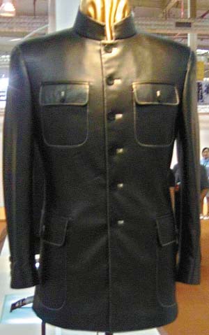 昨天下午,記者現(xiàn)場(chǎng)看到,該展區(qū)的中山裝除了傳統(tǒng)的老款式外,還包括了很多新穎的款式,例如,用香云紗、皮料制作的中山裝,用意大利進(jìn)口面料制作的中山裝……
