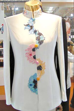 有一款中山裝制作最為新潮,衣領(lǐng)圖案是奧運(yùn)五環(huán),前襟圖案則是一條飛龍,如果仔細(xì)觀察可以發(fā)現(xiàn),該條飛龍是用類似奧運(yùn)福娃的局部圖案巧妙地拼接而成的。