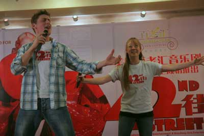 昨天下午,《42街》的幾位主演來到深圳大廈舉行了媒體見面會。為了增加現場氣氛,兩位中國年輕的踢踏舞演員被請上臺,一段熟練的舞蹈動作顯示了不俗的實力。盡管跟現場這些來自百老匯的專業(yè)舞者無法相提并論,但是他們的表演還是贏得了一片掌聲,而百老匯的演員們更是起身鼓掌叫好。而《42街》的演員們也現場露了一手,從小就學習跳舞、唱歌的男主角查爾斯和畢業(yè)于音樂劇學校的女主角克利斯汀用聲情并茂的表演充分顯現出了他們的演唱功底。