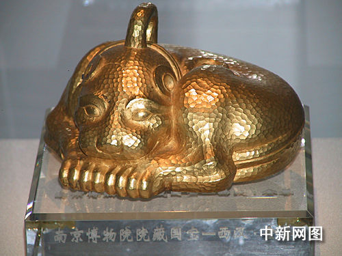 記者隔著玻璃窗看到,一只脖套項(xiàng)圈的金豹身覆鱗片,半蹲于座,鱗片在燈光映照下閃爍,光彩灼人,整座展品有著強(qiáng)烈的立體感!斑@叫金獸,古時(shí)作保財(cái)鎮(zhèn)庫之用,迄今為止仍是中國出土文物中最大最重的金器”,南京市博物院院長龔良如是說。