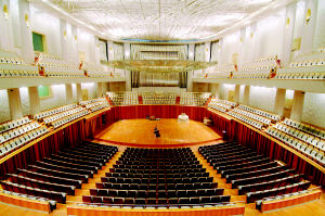 在公共空間的另一側,是設計獨特的戲劇場。戲劇場共計有1035個席位,具有濃郁民族色彩的絲布墻面體現(xiàn)出戲劇場親切、熱烈而傳統(tǒng)的氣氛,平時主要以戲曲、話劇演出為主。劇場內(nèi)設置的“鼓筒式”轉(zhuǎn)臺是根據(jù)德累斯頓歌劇院和英國皇家芭蕾舞劇院的舞臺組合出的新型轉(zhuǎn)臺,可以達到15塊臺邊移動、邊升降、邊旋轉(zhuǎn)的舞臺效果———演出話劇《江姐》的時候,只消升起兩塊臺板構成一個立體矩形,前邊再放上一只火盆,就構造出渣滓洞監(jiān)獄的陰森場景;如果把這些臺板漸次升起,就是可供合唱團站立的標準性臺階;如果把臺板按需要升起后再進行圓臺旋轉(zhuǎn),那么戲劇導演可以在數(shù)個舞臺場景瞬間切換。