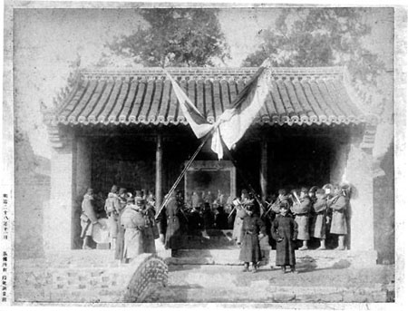 日軍占領(lǐng)威海衛(wèi)文廟(前城里中學)充做司令部,在門前敲鼓吹號。