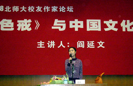 日前,女作家閻延文應(yīng)母校北師大文學(xué)院邀請,在北師大針對文化熱點(diǎn)問題,進(jìn)行了一場題為《色戒與中國文化》的講座。英東學(xué)術(shù)會堂,在講座開始前即已爆滿,兩個(gè)小時(shí)的講座始終處在熱烈氣氛中。