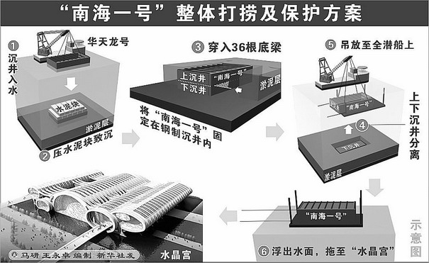 魏峻說,由于“南海一號”所在海域的海水能見度幾乎為零,水太深,采用傳統(tǒng)的水下考古方法,將無法對沉船和船載文物進(jìn)行準(zhǔn)確的測繪和記錄,必然會(huì)造成不少珍貴文物考古信息的丟失。古沉船在水下浸泡了800多年,船體非常脆弱,即使船載文物全部打撈出水,對于沉船本身的水下考古打撈也將會(huì)是一件非常困難的工作。因此,經(jīng)多方面專家的反復(fù)論證和研究,決定對“南海一號”沉船進(jìn)行整體打撈:將沉船、載物與其周圍泥沙按照原狀固定在特殊的鋼制沉箱內(nèi),將分散、易碎的文物一體化、一次性吊浮起運(yùn),然后遷移到能人為控制環(huán)境、保護(hù)較好的“水晶宮”中進(jìn)行科學(xué)的水下考古發(fā)掘。