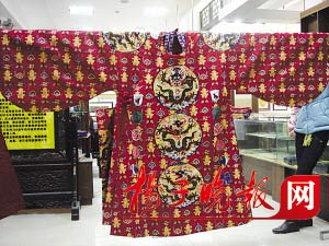 當(dāng)工作人員小心地展開“紅緙絲十二章福壽如意袞服”時(shí),記者被眼前的景象驚呆了:滿眼都是富麗堂皇、珠光寶氣,因?yàn)榭椩鞎r(shí)大面積夾進(jìn)了8168米真金線,而且使用了由孔雀羽毛捻成的400米翠羽線,無論從哪個(gè)角度看,都金光耀眼,價(jià)值十分昂貴。此件文物出土于萬歷帝棺內(nèi)西部北側(cè),復(fù)制工作歷時(shí)2年,織造時(shí)分為13片。