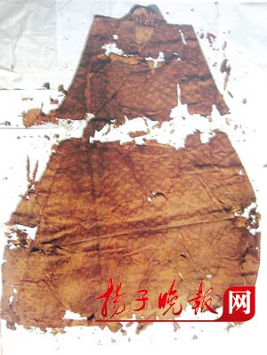 照片中,一堆已經(jīng)損壞的咖啡色織物,殘缺不全、圖案斷續(xù)、毫無光澤,就好像枯萎的花朵一般。如果不是專家介紹,沒有人會(huì)將它們和明代皇帝、云錦聯(lián)系在一起。這件“中單”出土于萬歷帝棺內(nèi)中部中間,剛剛出土?xí)r,是金光閃閃的,但是在與空氣接觸后,迅速氧化、褪色。通過云錦研究所的復(fù)制,記者見識(shí)了“紅八寶四合云紋綢交領(lǐng)中單”當(dāng)年的風(fēng)采,“中單”無袖,里與面之間夾了一層薄棉絮,凸于表面的紋樣是象征“物華天寶”的八寶紋。據(jù)介紹,此件“中單”類似于現(xiàn)代的襯衫,“小衣之外、大衣之中”,尺寸一般小于袞服、龍袍一寸,長(zhǎng)四尺。