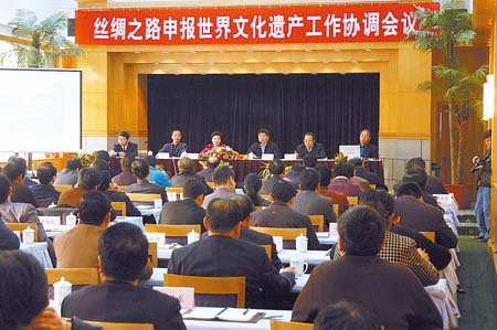 12月28日上午9時(shí),絲綢之路申報(bào)世界文化遺產(chǎn)工作協(xié)調(diào)會議在蘭州飯店8樓會議室召開,國家文物局局長單霽翔、甘肅省副省長咸輝、國家文物局文物保護(hù)司司長顧玉才及79名相關(guān)省區(qū)代表參加了當(dāng)天的會議。會上,單霽翔向與會代表強(qiáng)調(diào)了絲路申遺的重大意義,并指出了全國48個(gè)申遺點(diǎn)存在的問題和不足。
