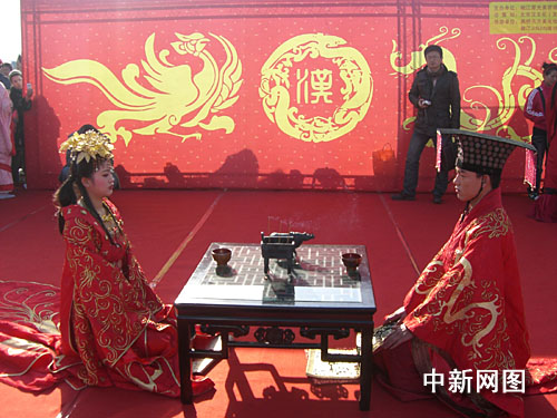 2008新年伊始,浙江省臺(tái)州市一行人身著漢服在莊重而又喜慶的古樂伴奏下,昂首闊步向市中心廣場走去。經(jīng)了解得知,這是臺(tái)州市首次舉辦的傳統(tǒng)漢民族婚禮展示;顒(dòng)由傳統(tǒng)漢民族婚禮表演、漢民族婚服展示、傳統(tǒng)漢婚有獎(jiǎng)知識(shí)問答三部分組成。