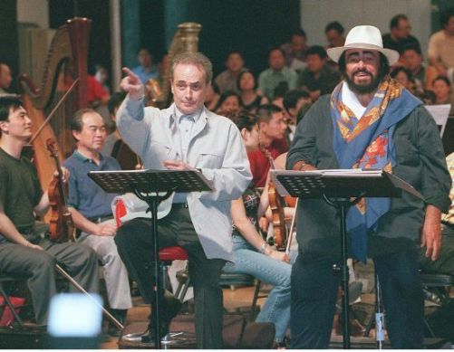 2001年6月,先期到達(dá)北京參加世界三大男高音午門演唱會的帕瓦羅蒂和卡雷拉斯,20日下午與中國中央歌劇院的演員和樂隊(duì)一起排練。 中新社發(fā) 李剛 攝