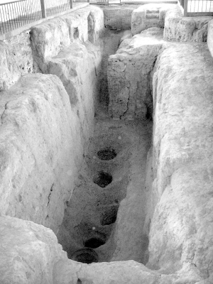 新鄭市博物館館長杜平安介紹說,長方形豎井底部南北長8.7米,東西寬2.5米,深2.24~3.35米,在地下室的東南角筑有一條斜長7.3米、寬0.58~0.7米,共有13級臺階的通道,傾斜度為50度!斑@種深入地下3米多,四壁又用夯土建筑,進(jìn)入地下通道又窄又陡的建筑設(shè)計(jì),是出于保持地下溫度低于地上溫度而考慮的。”