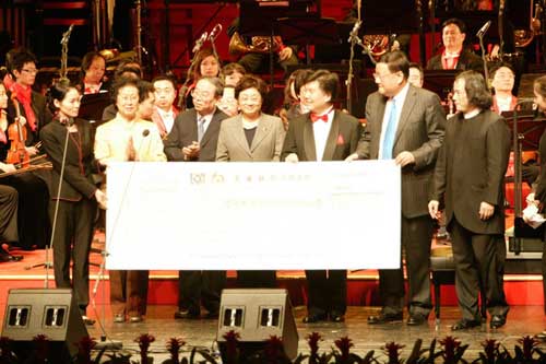 全場的最高潮無疑是3家主辦方?jīng)Q定將門票收入所得共103.9720萬元票款的支票交到中華慈善總會代表的手中,委托其捐獻給受雨雪災害最嚴重的湖南、貴州、廣西等省區(qū)市時,觀看演出的觀眾紛紛起立,掌聲如雷鳴般鼓動。