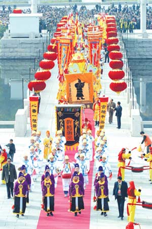 陜西省清明公祭軒轅黃帝典禮籌備工作委員會近日發(fā)出公告,向全球首次征集戊子(2008)年清明公祭軒轅黃帝祭文,并公開表示,今年的戊子年清明公祭軒轅黃帝典禮將于4月4日上午9:50在黃陵縣橋山軒轅殿廣場隆重舉行。公祭典禮舉行當(dāng)天,軒轅廟前將以彩旗、龍旗裝扮,軒轅橋至軒轅殿通鋪地毯。軒轅橋欄將安置34個(gè)大紅燈籠,登陵神道,主要街道,軒轅大道,橋山廣場等地方將用空飄彩球,龍旗,宮燈,花燈等進(jìn)行裝扮烘托,營造隆重氣氛。