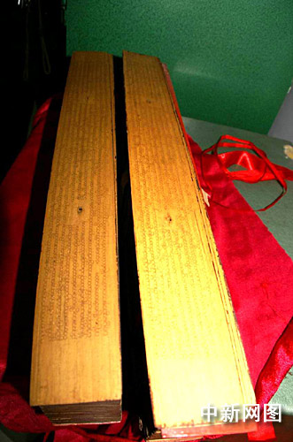 記者在贈(zèng)送儀式上看到,《貝葉經(jīng)》用紅綢布包得嚴(yán)嚴(yán)實(shí)實(shí)放在一個(gè)托盤(pán)上。儀式結(jié)束后,寶峰寺中主持輕輕打開(kāi)了紅綢布,經(jīng)書(shū)漸漸露了出來(lái)。經(jīng)書(shū)長(zhǎng)約四十厘米,寬、厚均有十多厘米。