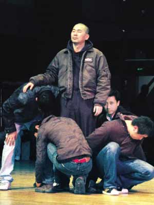 在片場(chǎng)以嚴(yán)厲著稱的尹導(dǎo)在排練場(chǎng)上也不改其作風(fēng),一會(huì)兒忙著指揮工作人員在每個(gè)確定走位處貼上地標(biāo),給每樣道具的位置做標(biāo)記,一會(huì)兒吆喝兩句“精神集中,每一遍都有新要求……”難怪在談到導(dǎo)演時(shí),韓童生毫不諱言:“尹導(dǎo)就像一個(gè)幽靈、魔鬼,他的嚴(yán)格帶給我巨大的壓力,每天的排練都很痛苦,在這種窒息的環(huán)境中我們要做到的就是靈魂出竅。”當(dāng)然,在演員表現(xiàn)精彩的時(shí)候,尹力也會(huì)拿起相機(jī)一陣狂拍,并不時(shí)要求全場(chǎng)演員鼓掌慶賀;而當(dāng)演員表演達(dá)不到要求時(shí),尹導(dǎo)更是親自做起了示范,其生動(dòng)的肢體語(yǔ)言不時(shí)引起全場(chǎng)的爆笑。