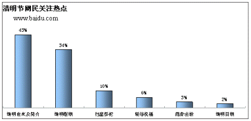 此外,報告還顯示,網(wǎng)民對清明假期的關注度很高,檢索比例達到34%,這是由于今年的清明是我國首次將其列為法定節(jié)日;谕瑯拥睦碛桑W(wǎng)民對“短信祝!、“踏青出游”的關注度也比較高。