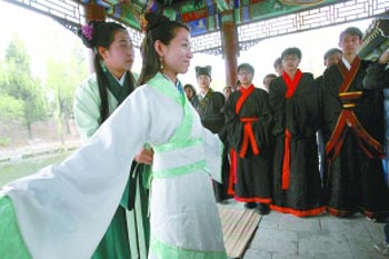 兩名女大學(xué)生正在展示漢服。昨日,20多名女大學(xué)生相聚清華大學(xué),她們身著傳統(tǒng)漢服,演示了古代女子的成人禮———笄禮。女學(xué)生們進(jìn)行了三次叩拜,拜天地、拜父母、拜祖國(guó);三次加裝,服飾一次比一次華貴,象征女子成長(zhǎng)的過程。最后經(jīng)過上香、敬酒等多個(gè)程序,成人禮才宣告結(jié)束。笄禮是古代女子訂婚以后、出嫁之前所行的禮,目的是對(duì)她們的人生責(zé)任、社會(huì)角色進(jìn)行提醒。