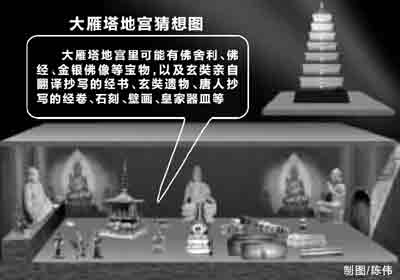 。兾鳎┦∩缈圃鹤诮萄芯克L王亞榮日前介紹,和法門寺寶塔下有地宮一樣,大雁塔下也藏有千年地宮。據(jù)推測,玄奘自印度取經歸來后,所帶回的珍寶有很多藏在大雁塔下的地宮里。