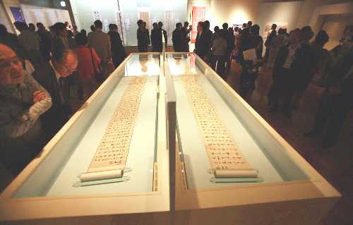 7月14日,在日本東京,人們?cè)诮瓚魱|京博物館舉行的預(yù)覽會(huì)上觀賞故宮所藏的書(shū)法作品。為紀(jì)念中日和平友好條約締結(jié)30周年,7月15日起,以王羲之《蘭亭序》為代表的65件北京故宮館藏歷代書(shū)法名品將在東京進(jìn)行為期2個(gè)月的展出 。其中,《蘭亭序》是首次在日本亮相。