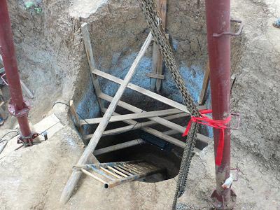 昨天下午,早報記者來到考古現(xiàn)場,看到一個小型起吊機已深入“井內”。據介紹,圓形的地宮如同一口深井,直徑2.2米,在圓井的正中間,還發(fā)現(xiàn)四塊石板拼起的方框,未見滲水,放有一層銅錢。華國榮表示,結構和內容正在逐步認識過程中。