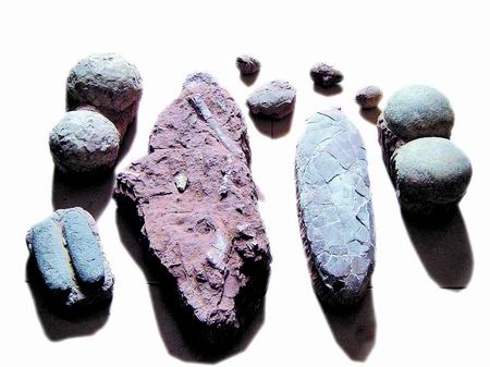 “這是村民們開山修筑趙營村至金花村‘村村通’公路時發(fā)現的!睆堌S臣說,“目前,僅新修公路沿線兩公里范圍內就發(fā)現有二十多窩這樣的恐龍蛋化石,估計實際蘊藏量不下100窩。同時還發(fā)現了樹枝蛋、戈壁棱柱形蛋等十多種恐龍蛋化石!痹诖宀,張豐臣向記者展示了臨時保存的修路施工中拾到的蛋化石和龍骨化石。