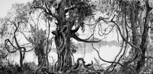 觸動吳冠中創(chuàng)作此畫的是蘇州郊外司徒廟的四株漢柏。它們曾遭雷劈,后又復蘇,從斷干折枝中再發(fā)新芽,于是再生枝藤。乾隆皇帝曾以“清”、“奇”、“古”、“怪”分別命名。
