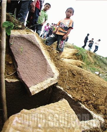 發(fā)現(xiàn)古墓的工人易德忠不停地拿著相機(jī)轉(zhuǎn)悠,見到記者他遺憾的說(shuō),“為了保護(hù)墓室,我們已按要求回填了泥土,恐怕在發(fā)掘完成前,你都見不到有著大柱子、梯步的墓室和精美的墓門板咯!惫拍谷含F(xiàn)場(chǎng),記者只見到了未被封嚴(yán)的墳?zāi)苟纯冢渖弦呀?jīng)放置了大石板。墓里淌滿了水,但沒(méi)有異味。