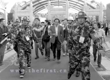 講座全部結(jié)束時,為使閻崇年能穿過人群順利到達方澤壇北門的休息室,約有十幾名安保人員為其開道,幾乎是“架”著閻崇年離開會場,不時有熱情的讀者欲遞過書簽名,但是卻完全不能接近。