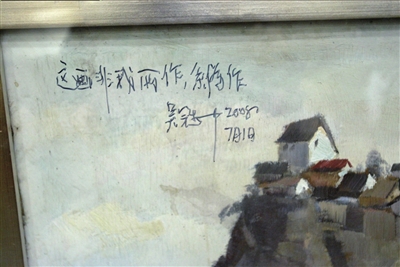 玻璃罩的左上方,寫著“這畫非我所作,系偽作”,落款為“吳冠中2008年7月1日”。為了保護(hù)這一能夠證明真?zhèn)蔚恼滟F字跡,蘇女士一方在脫下和套上保護(hù)膜時(shí)小心翼翼,生怕蹭掉一點(diǎn)字跡。