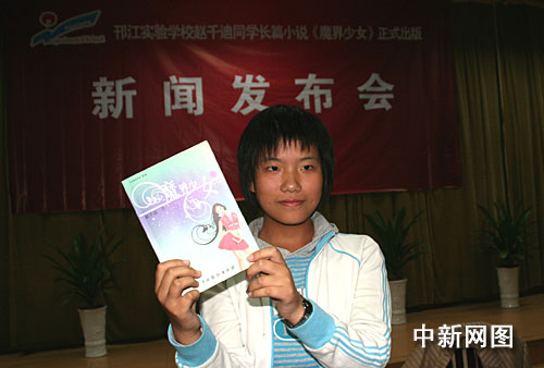 中新網(wǎng)揚(yáng)州10月17日電(記者崔佳明)10月17日下午,江蘇省揚(yáng)州市邗江實(shí)驗(yàn)學(xué)校舉行新聞發(fā)布會(huì),宣布該校初三學(xué)生趙千迪的十八萬字長篇小說《魔界少女》第一季終于于今年二月創(chuàng)作完成,并于八月份由中國戲劇出版社正式出版發(fā)行。揚(yáng)州市作家協(xié)會(huì)主席正式宣布,吸收趙千迪入會(huì),成為該市年齡最小的作家。