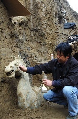 近日,考古人員在襄樊市長虹路一建設(shè)工地進行搶救性發(fā)掘時,發(fā)現(xiàn)一大型魏晉早期墓葬,并從該墓葬后室中發(fā)掘出玉璧、水晶珠、青銅熏爐等數(shù)十件珍貴器物。專家們從出土的文物分析,該墓應(yīng)是魏晉早期的夫妻合葬墓,墓主人的身份相當于大將軍級別。隨后,考古人員在發(fā)掘、清理前堂文物時,又發(fā)現(xiàn)了一匹與真馬體形接近的青銅馬。到昨天,整個銅馬已露出泥土80厘米高。據(jù)初步分析,銅馬高度為1.8米左右,重約2噸。