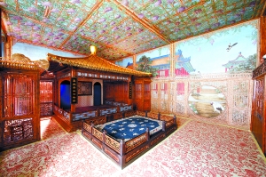 上午,記者在修復(fù)完工的倦勤齋內(nèi)看到:倦勤齋共面闊9間,以木裝修隔成了上下兩層的凹字形仙樓。最巧妙的是,齋內(nèi)各房間之間均以隔扇、檻窗、落地罩、炕罩等隔成相對獨立的空間。齋內(nèi)用歐洲透視方法繪出的絹面通景畫覆蓋了整個房間,據(jù)介紹整個倦勤齋有70余張畫,其中頂棚處有12張,全部約170平方米,如此大量反映18世紀(jì)歐洲美學(xué)對中國裝飾藝術(shù)影響的通景畫,不僅在紫禁城而且在全中國也是絕無僅有的。當(dāng)年乾隆皇帝觀戲的小戲臺被裝飾得古色古香,戲臺上方的天花板上全部都是枝藤茂密的紫羅蘭圖案通景畫,房間的墻壁上則細(xì)膩地描繪了紫禁城里的建筑和山石景色。而在以仙樓圍成的中廳內(nèi),精美的竹絲鑲嵌、玉雕和木雕藝術(shù)同樣令人嘆為觀止。