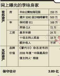 在06年被曝光的一份主持人走穴身價清單上,李詠以18萬的身價高居榜首。而后他代言某地板品牌的消息也引起爭議,節(jié)目組聲稱李詠只是跟老板合影,是品牌自己在炒作而已,堅決否認做了廣告,再加上名下價值百萬的保時捷跑車,李詠這個名字的含金量當然讓人咋舌。在采訪中,與先前的韓喬生一樣,這些主持人都說自己沒什么錢,一個月也就一萬來塊,跟明星完全沒辦法比。話音剛落,李詠的名字又赫然出現(xiàn)在最有價值主持人排行榜榜首,可能是受金融危機影響,縮水1.1億,但總價也有3.89億。