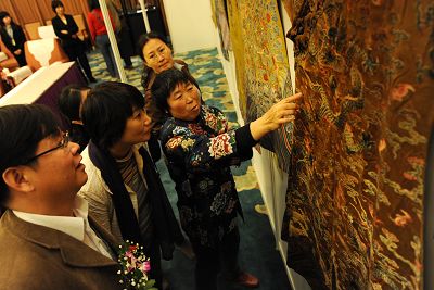 包括清代順治帝明黃地緙織服袍、康熙明黃地織五彩云龍紋妝花緞夾朝袍在內(nèi)的一批清宮龍袍下月初將于北京北緯秋拍會上拍賣。前天,這些龍袍在北京2008宮廷藝術(shù)品論壇上亮相后備受文物界關(guān)注。據(jù)故宮博物院宮廷織繡研究專家宗鳳英介紹,此次集中亮相的共有18件清宮龍袍,能征集到這樣高檔的拍品,非常難得。