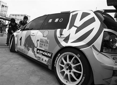 昨日中午1點(diǎn)多,記者趕到成都金港賽道,比賽還沒有開始,工作人員正在檢修各個選手的賽車。記者走進(jìn)大眾333車隊的車庫,發(fā)現(xiàn)一輛賽車上寫了一個大大的“寒”字,記者轉(zhuǎn)到車的另一邊,果然,側(cè)面車窗上清楚地貼著“韓寒”兩個字。