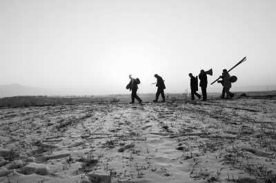 王水龍戲班外出演戲,走在空曠的雪地上,他們的身影有些孤獨(dú)。