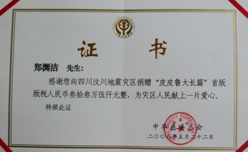 針對有媒體質(zhì)疑抗震“假捐款”,童話大王鄭淵潔(blog)7日17時54分在博客上,干脆把三十三萬五千元《皮皮魯總動員》稿費捐款證書和收據(jù)都曬出來,還有他監(jiān)護五萬袋干吃面(價值兩萬五千元)從北京啟程運往災區(qū)的照片,此外他還捐贈價值兩萬元的《皮皮魯總動員》。