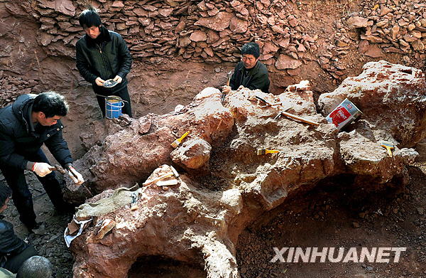 河南省汝陽縣恐龍化石發(fā)掘近日又有重大進展,在汝陽縣劉店鄉(xiāng)發(fā)現(xiàn)了成片密集化石區(qū),出土的恐龍化石形體巨大,粗壯異常,其中最大的一塊長3.3米、寬2.3米。經專家認定,這塊巨型恐龍化石比2007年7月命名的亞洲最大恐龍化石“汝陽黃河巨龍”大很多,究竟屬于什么恐龍屬種還需進