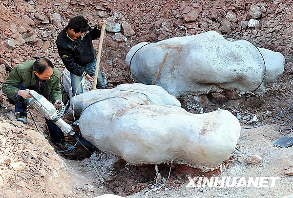 在汝陽縣劉店鄉(xiāng)圣水溝村,工作人員將挖掘出的大型恐龍化石經過科學分割后打上石膏,以便妥善保存(12月1日攝)。新華社記者 王頌 攝
