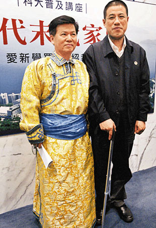 科大老師穿上愛新覺(jué)羅恒紹(右)帶來(lái)的皇家滿族服飾,一沾“皇氣”。(圖片來(lái)源:文匯報(bào))