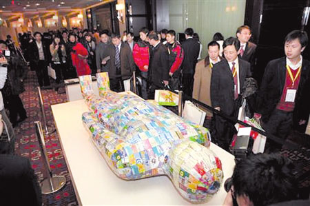 不久前,國內(nèi)的金融界人士匯聚北京,但在會(huì)議期間,他們被現(xiàn)場(chǎng)一件當(dāng)代雕塑給震撼了,這是一個(gè)身長3.3米,用去1720張銀行卡、充值卡和消費(fèi)卡,使用100米銅線,完全采用漢代手工技藝制成的“金縷玉衣”,外形和1968年出土的那件文物一模一樣。據(jù)刁建中介紹,這件作品的名字叫《金縷玉衣2008》,創(chuàng)作歷時(shí)15個(gè)月,從多年收集的萬余張卡中精心挑選了1720張卡。他表示,選擇“卡”作為介質(zhì),因?yàn)榭ㄗ鳛樽髌返乃囆g(shù)元素具有廣泛的社會(huì)屬性,是對(duì)人們消費(fèi)的一種梳理和認(rèn)同。刁建中希望通過這種承載大量社會(huì)信息的卡借用金縷玉衣的形式來表達(dá)當(dāng)代的社會(huì)現(xiàn)象。