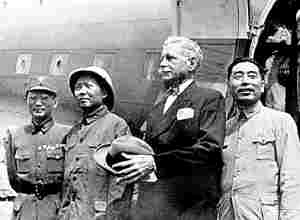 1945年8月28日,毛澤東赴重慶談判。臨行前,他換了換裝,穿上了葉劍英特地給他買的皮鞋和在北京給他訂做的一套藍灰色中山裝。江青到蘇聯(lián)醫(yī)生阿拉夫那里為毛澤東借來了一頂禮帽。周恩來上上下下打量毛澤東這身裝束,毛澤東說:“怎么,嫌我穿得太洋氣?”周恩來說:“不,我是看主席戴的帽子好像有點小!闭f著,摘下自己頭頂上的盔式太陽帽遞給毛澤東:“主席,你戴上這頂試試,重慶的日光是很強烈的!泵珴蓶|接過太陽帽戴上,不大不小正合適。周圍的同志也說好。毛澤東風(fēng)趣地說:“恩來,我可奪人所好啰!”并問周恩來:“你戴什么呢?”周恩來說:“我還有,再說,重慶我比你熟,總可以搞到一頂,這頂就送給你吧!庇谑牵珴蓶|就戴上這頂盔式太陽帽登上飛機,去了重慶,并在重慶機場留下了一張頭戴盔式禮帽的歷史照片。