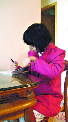 淡粉色毛衣、棗紅色外套、白色褲子、可愛的娃娃頭短發(fā),瘦小的陳楠看起來像是一名中學(xué)生。盡管她每邁一步就要停下一會(huì)調(diào)整步伐,但當(dāng)記者走進(jìn)她家時(shí),她還是熱情地起身到門口迎接。雖然說話比較費(fèi)力,吐字也并不清晰,但她的思維和反應(yīng)都很快,她會(huì)側(cè)仰著頭仔細(xì)傾聽你的問題,然后迅速接下話茬,努力嚅動(dòng)嘴唇發(fā)音,說到興起之處,她還會(huì)像個(gè)孩子般發(fā)出爽朗的笑聲!拔易畲蟮膲粝刖褪钱(dāng)個(gè)作家,不過還真沒想到在25歲時(shí)就能出書呢!