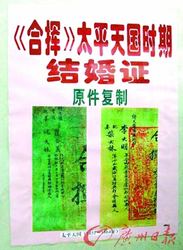 《合揮》中合是結(jié)合,揮是憑證之意,太平天國(guó)時(shí)期廢除封建買(mǎi)賣(mài)婚姻,男女雙方要求結(jié)婚時(shí),先經(jīng)過(guò)主管婚姻的婚娶官批準(zhǔn),然后發(fā)給繪有龍鳳圖記的《合揮》婚書(shū),方能成婚。