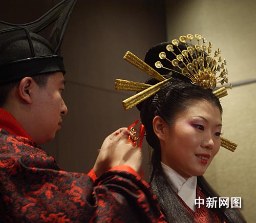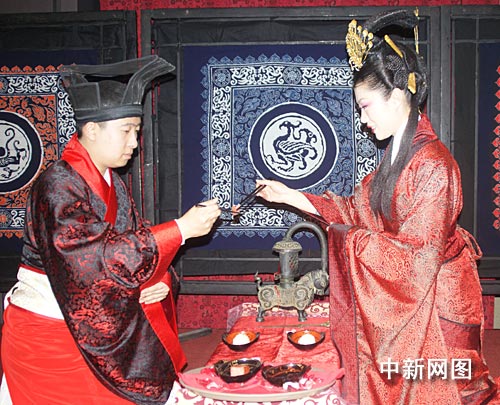 中新網(wǎng)2月2日電 春節(jié)期間,一對(duì)山東濟(jì)南新人專程來京,舉辦了一場(chǎng)莊嚴(yán)神圣的周制婚禮。與以往婚禮不同處在于,此次婚禮并未邀請(qǐng)賓客,且全場(chǎng)參禮者均著漢服,故而由醮子、催妝、送親、合巹、拜父母恩等環(huán)節(jié)組成的整場(chǎng)儀程就顯得尤為高貴典雅、神圣肅穆,傳統(tǒng)漢婚文化被演繹成類似情景劇的形式,漢“昏禮”元素被彰顯的淋漓盡致。